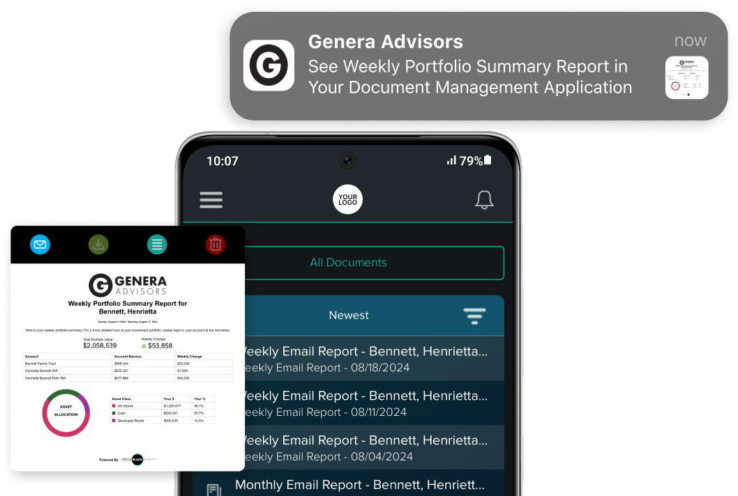 Share reports and insights through standard or customized templates that inform clients, address specific requests, and guide conversations. All documents are delivered and securely stored within the Investor Experience app, available on web and mobile.